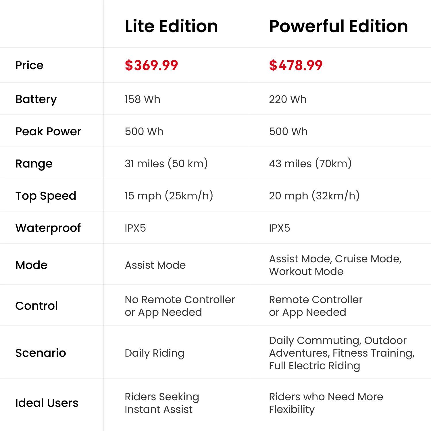 Battery Safety ❌ No BMS, risk of overcharge or short-circuit Smart BMS — dual protection, longer battery life for years of riding